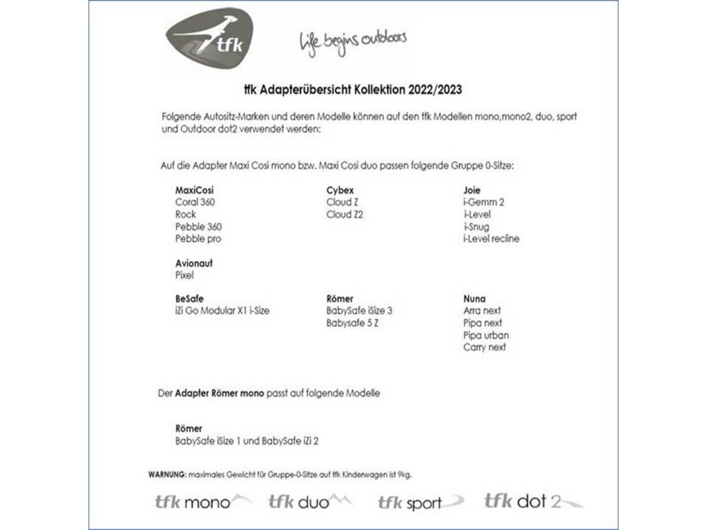 S príchodom bábätka život začína. Je nutné zmeniť množstvo zažitých vecí av mnohom sa bábätku prispôsobiť. Spoločnosť TFK sa snaží o to, aby rodinu doterajšie záujmy a koníčky spájali, či už aktívnym alebo pasívnym odpočinkom. Už viac ako 20 rokov TFK pracuje na tom, aby rodičia mohli svoj čas zdieľať aj s bábätkom. Vďaka dlhoročným skúsenostiam TFK vyrába a inovuje detské kočíky pre outdoorové a športové využitie.