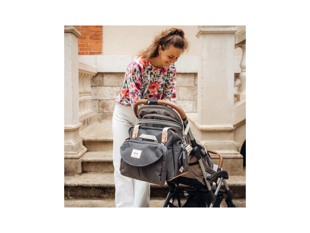 Priestranná prebaľovacia taška 2v1 Beaba Geneva vám zjednoduší a spríjemní cestovanie s bábätkom. Oddeliteľné puzdro na prehľadné ukladanie peňaženky, mobilu, kľúčov a pod. v prednej časti ponúka maximálnu variabilitu pri používaní tašky. Veľký vnútorný priestor je vybavený niekoľkými vreckami na uloženie potrieb pre dieťa. Súčasťou je aj samostatná priestranná termoizolačná taška na detské jedlo a nápoje, prebaľovacia podložka, závesné antibakteriálne puzdro na cumlík a dva úchyty na zavesenie na madlo kočíka.Ramenný popruh s polstrovaním aj držadlá na nosenie v ruke umožňujú pohodlné prenášanie.Na zadnej strane tašky je úchyt na umiestnenie tašky na vysúvaciu rukoväť kufríka na kolieskach.