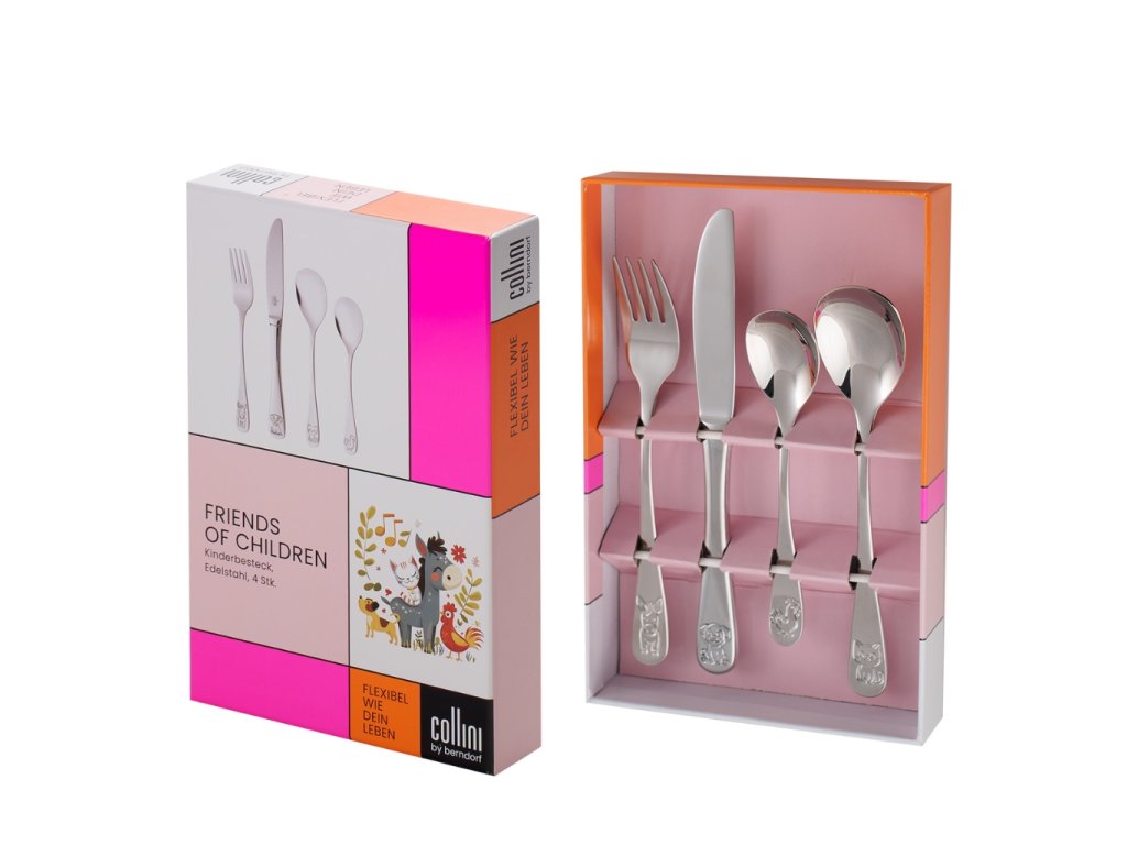 Detský príbor Friends of Children prináša deťom zábavu a motiváciu pri stolovaní. Je inšpirovaný obľúbenou rozprávkou Brémski muzikanti a na rukovätiach nájdete farebné motívy zvieratiek, ktoré povzbudzujú deti k samostatnému jedeniu.