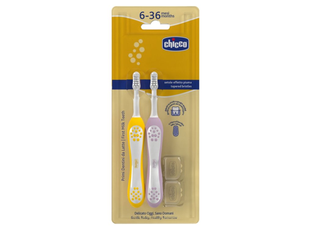 Začnite s ústnou hygienou už od prvých zúbkov s kefkami "Chicco zubné kefky pre deti Lilac-Mustard 6-36 mesiacov"!