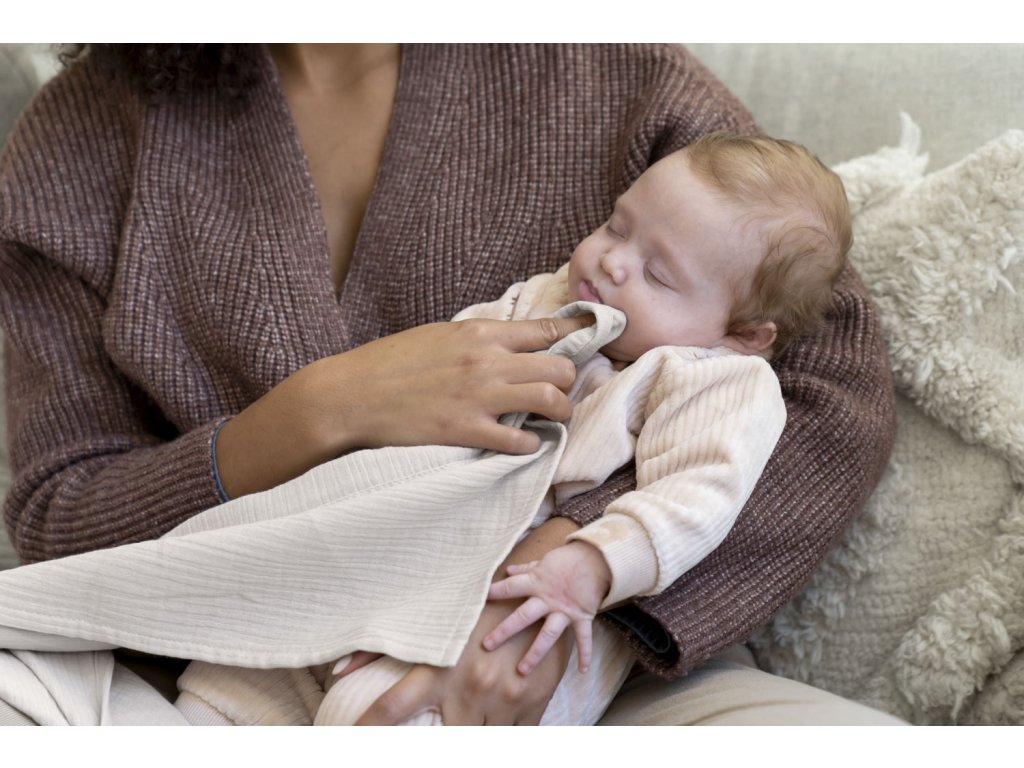 - Viacúčelové využitie: Slúži ako dojčiaca prikrývka, hryzátko, ľahká deka alebo osuška na tvár.