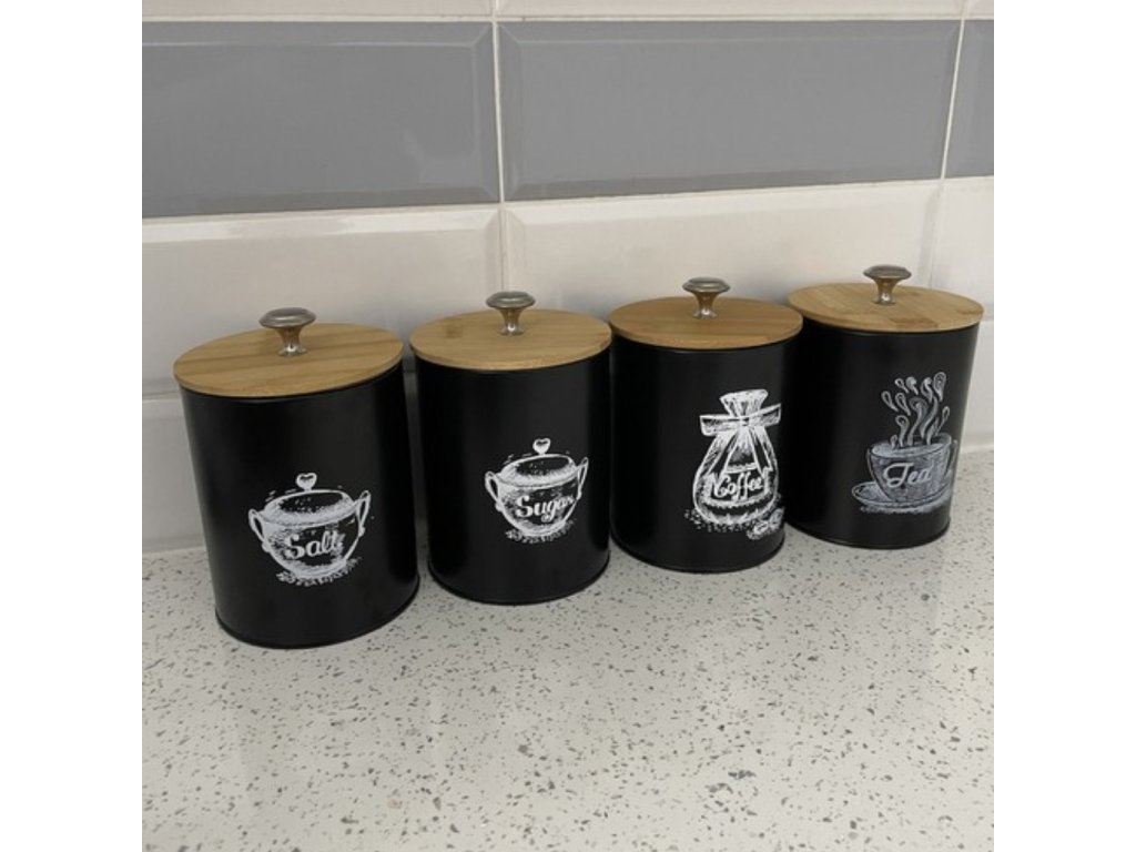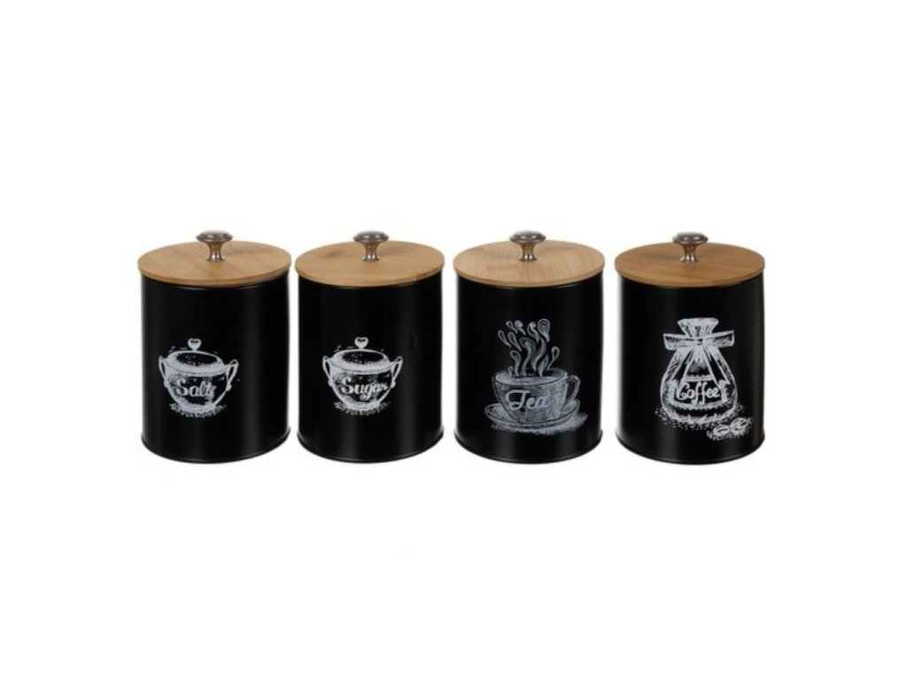 Objavte štýlové a praktické riešenie pre uskladnenie vašich obľúbených sypkých potravín! Sada štyroch dóz s objemom 1,3 litra je ideálna na uchovávanie cukru, čaju, soli a kávy. Každá dóza je označená bielym textom a obrázkom v angličtine, takže vždy presne viete, čo sa v nej ukrýva.