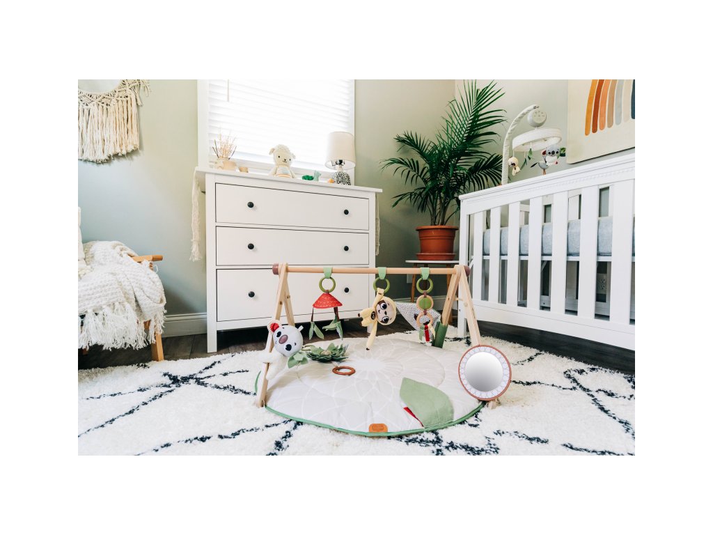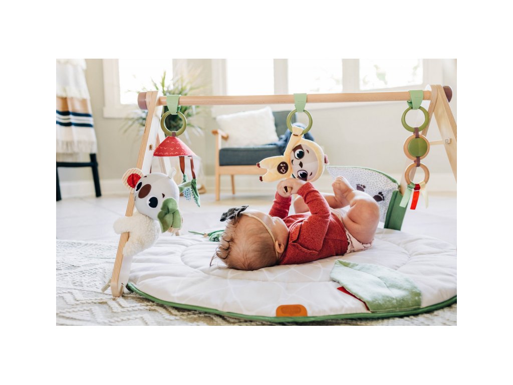Hracia deka s hrazdou Tiny Love Boho Chic v luxusnom prevedení s drevenou hrazdou ponúka rôzne aktivity na zabavenie a stimuláciu zmyslov dieťaťa od narodenia.Extra mäkké polstrovanie a jemná tkanina zaistí dieťaťu na deke maximálne pohodlie. 20 vývojových aktivít dieťa zabaví a zároveň stimuluje jeho jednotlivé zmysly. Hudobná hračka v podobe neodolateľného leňochoda pri pohybe jemne hrká a stlačením miesta na brušku sa aktivuje jedna z piatich melódií. Pozornosť dieťaťa upúta šplhajúca plyšová koala, drevené krúžky s hrkálkou a stužkami aj eukalyptové lístky s čiernobielym výrazným vzorom. Veľký list pri pohybe hrká, dieťa do neho môže kopať nožičkami. Bezpečné zrkadlo aj veľký kvet so šuštiacimi okvetnými listami a priehľadným stredom s korálkami podnecujú dieťa k hraniu na brušku. Jednotlivé závesné hračky je možné používať aj samostatne mimo deky.
