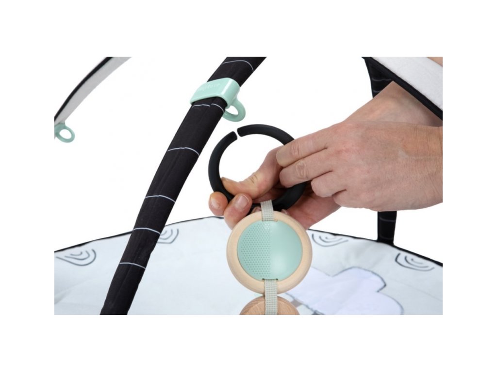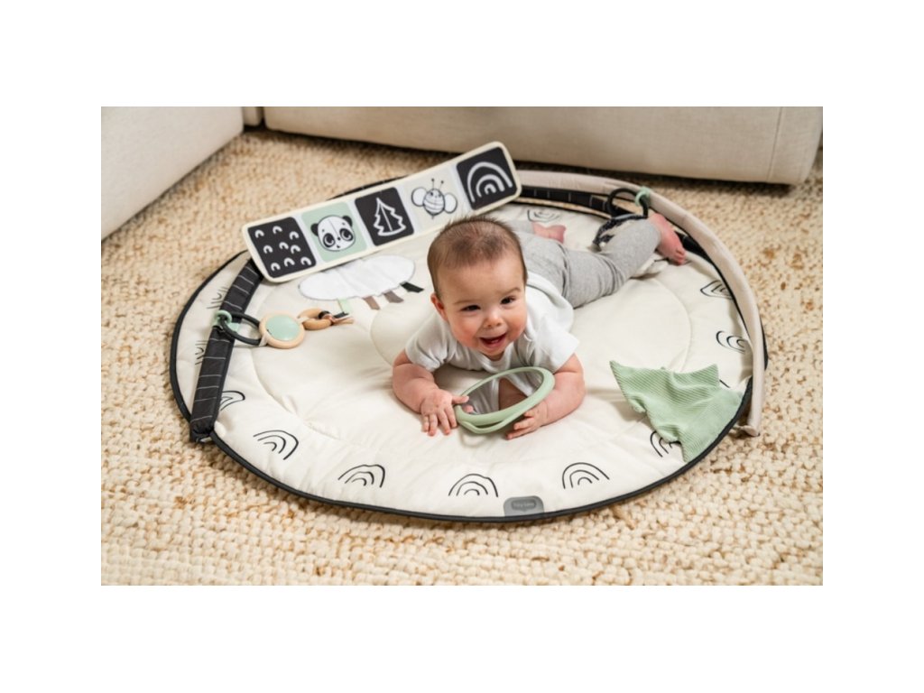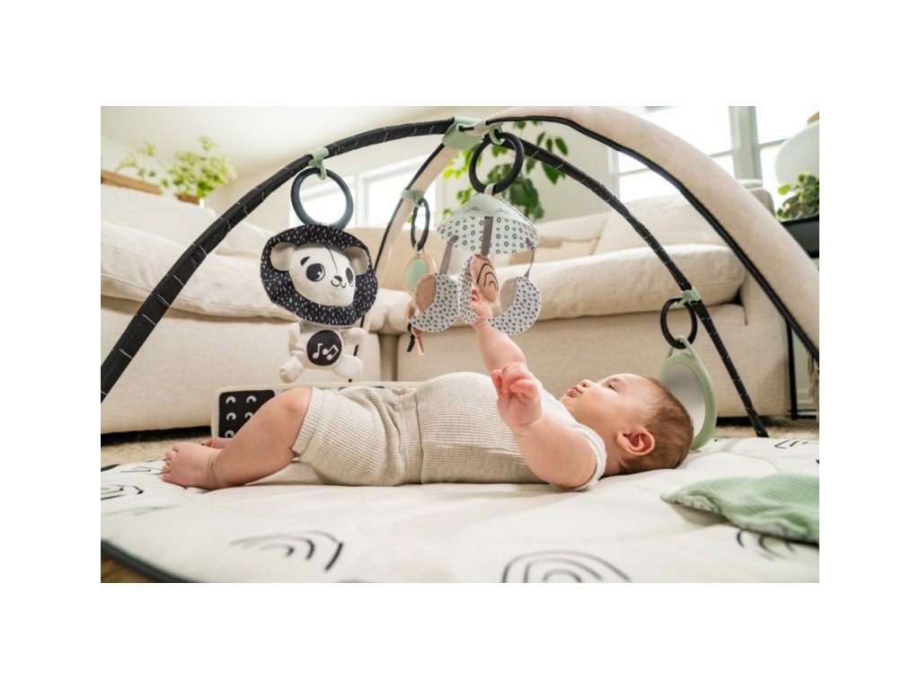 Hracia deka s hrazdou Tiny Love Gymini Black & White v unikátnom čierno-bielom prevedení, ktoré upúta pozornosť dieťaťa už od narodenia, ponúka rôzne aktivity na zabavenie a stimuláciu zmyslov dieťaťa.Posuvný stredový diel umožňuje prispôsobiť hrazdu veku dieťaťa, hranie na brušku a pod. Hudobný box v podobe leva hrá tri rôzne melódie a dieťa si ich aktivuje samo dotykom. Bezpečné zrkadlo a textilná knižka v tvare leporela podnecujú dieťa k hraniu na brušku. Závesné hračky a množstvo ďalších aktivít priamo na deke stimulujú rôzne zmysly dieťaťa. Jednotlivé hračky vrátane hudobného boxu je možné používať aj samostatne mimo deky.