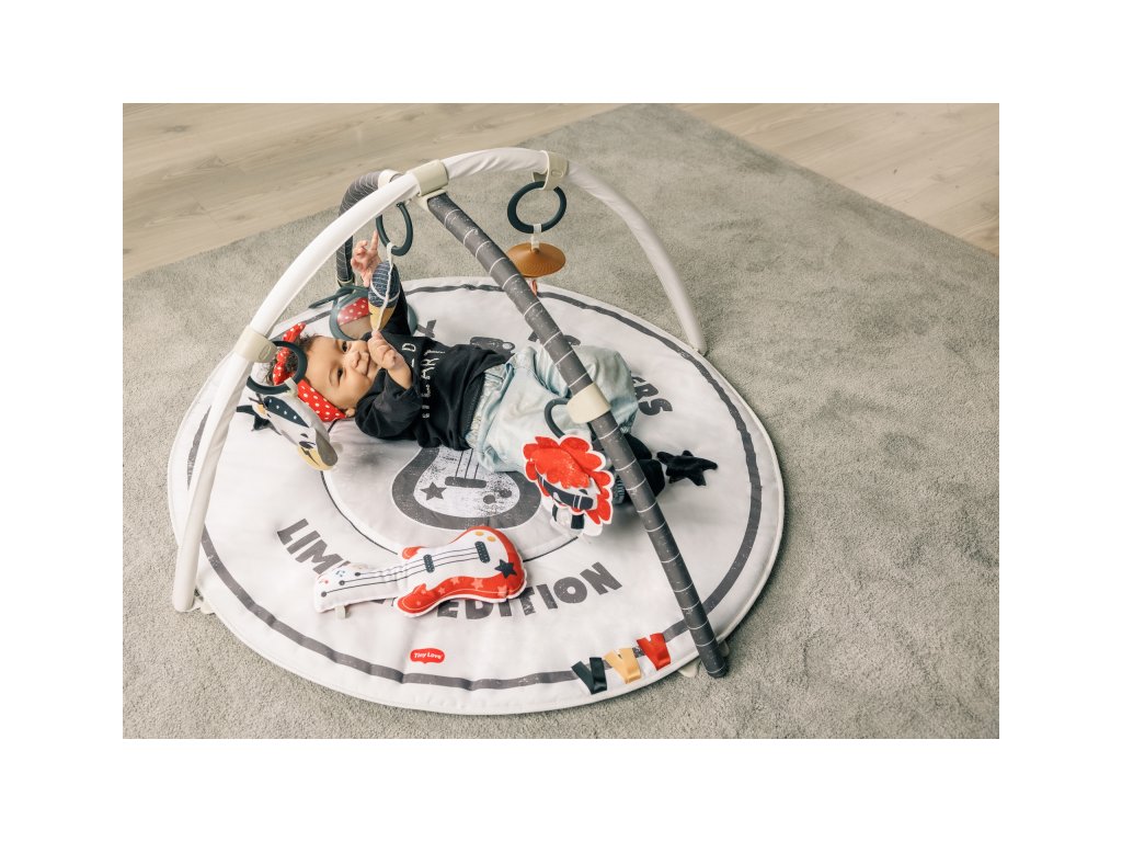 Hracia deka s hrazdou Tiny Love Gymini Tiny Rockers v unikátnom rockerskom prevedení, ktoré upúta pozornosť dieťaťa už od narodenia, ponúka rôzne aktivity na zabavenie a stimuláciu zmyslov dieťaťa.Posuvný stredový diel umožňuje prispôsobiť hrazdu veku dieťaťa, hraniu na brušku a pod. Hudobný box v podobe gitary hrá tri rôzne melódie a dieťa si ich aktivuje samo dotykom. Bezpečné zrkadlo aj hudobná gitara podnecujú dieťa k hraniu na brušku. Závesné hračky a množstvo ďalších aktivít priamo na deke stimulujú rôzne zmysly dieťaťa. Jednotlivé hračky je možné používať aj samostatne mimo deky.