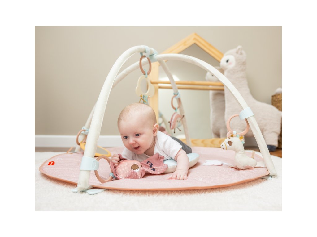 Hracia deka s hrazdou Tiny Love Gymini Unicorn Wonderlands v jemných pastelových farbách s rozprávkovým motívom jednorožca ponúka rôzne rozmanitosti na zabavenie a stimuláciu zmyslov dieťaťa už od narodenia.Posuvný stredový diel umožňuje prispôsobiť hrazdu veku dieťaťa, hranie na brušku a pod. Hudobný box v podobe kométy hrá melódie a dieťa si ich aktivuje samo dotykom. Bezpečné zrkadlo aj vankúšik v tvare polmesiaca podnecujú dieťa k hraniu na brušku. Závesné hračky vrátane hrkajúceho jednorožca a množstvo ďalších aktivít priamo na deke stimulujú rôzne zmysly dieťaťa. Jednotlivé hračky je možné používať aj samostatne mimo deky.