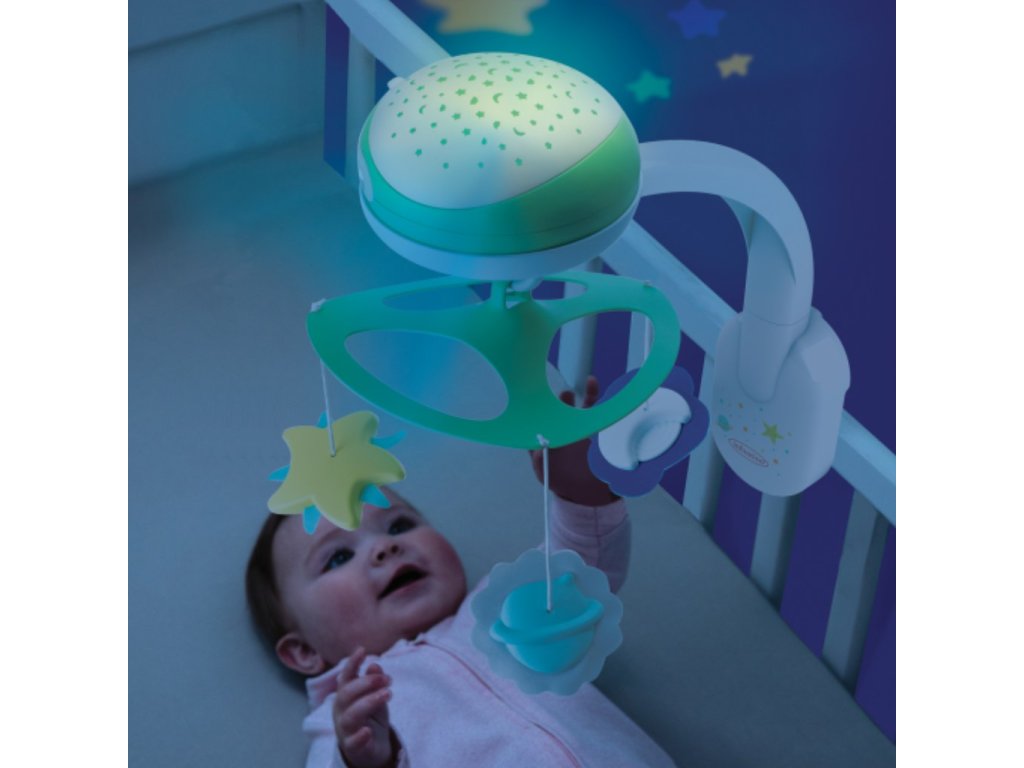 - 3v1 funkčnosť: Môže byť použitý ako hudobný kolotoč pre novorodencov až do 5 mesiacov, nočné svetielko a projektor do postieľky pre deti od 6 do 18 mesiacov a ako nočné svetielko s projektorom na nočný stolík pre deti od 18 mesiacov.