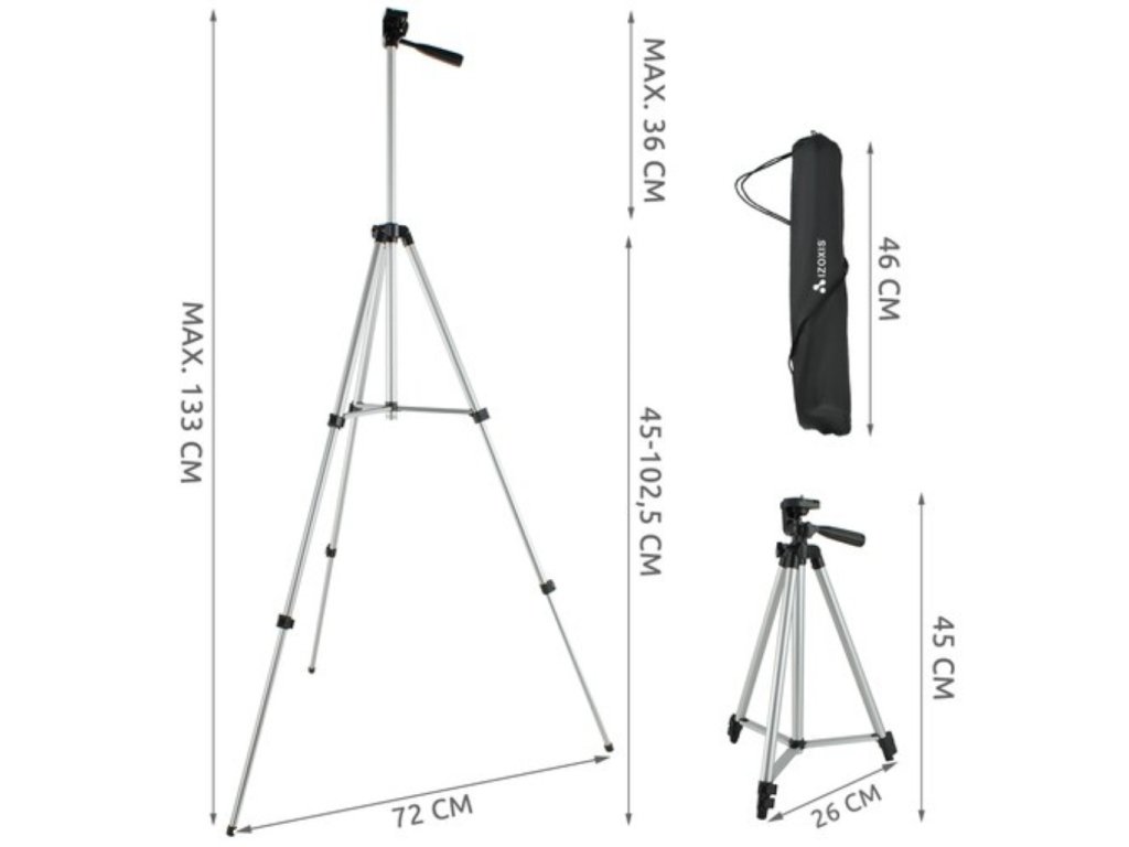 - ŠPECIFIKÁCIA – rozmery statívu (v min/max): 45-133cm; hmotnosť súpravy 450g.