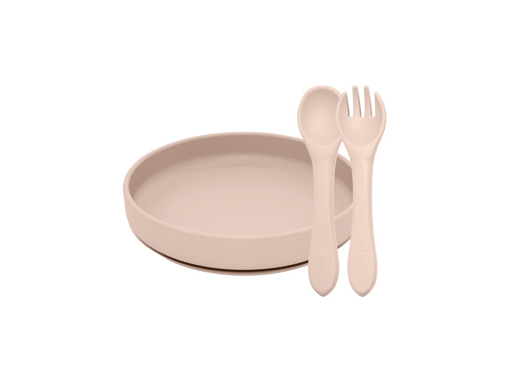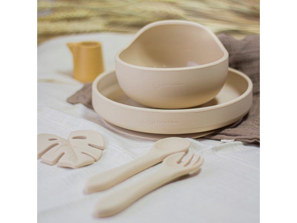 Jedálenská silikónová sada Petite&Mars Take&Match 2 kusy tanier + príbor Deset Sand