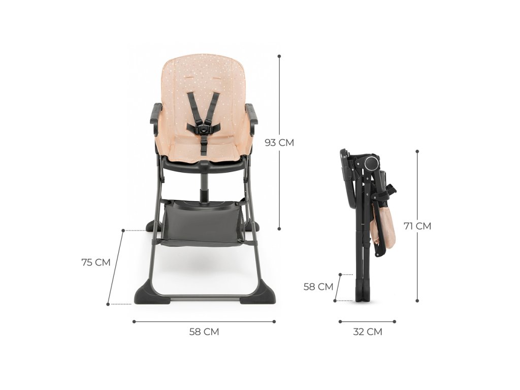 Stolička má pevný oceľový rám a je navrhnutá s dôrazom na stabilitu. 5-bodové bezpečnostné pásy zabezpečia, že aj aktívnejšie dieťatko zostane počas kŕmenia bezpečne na svojom mieste.