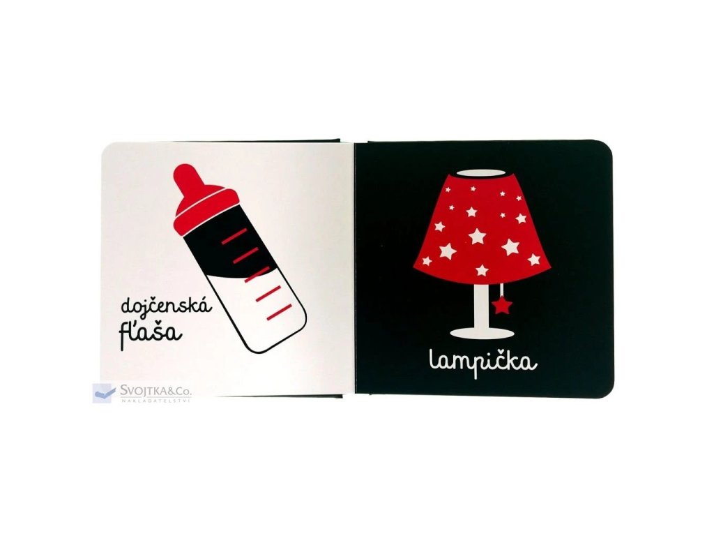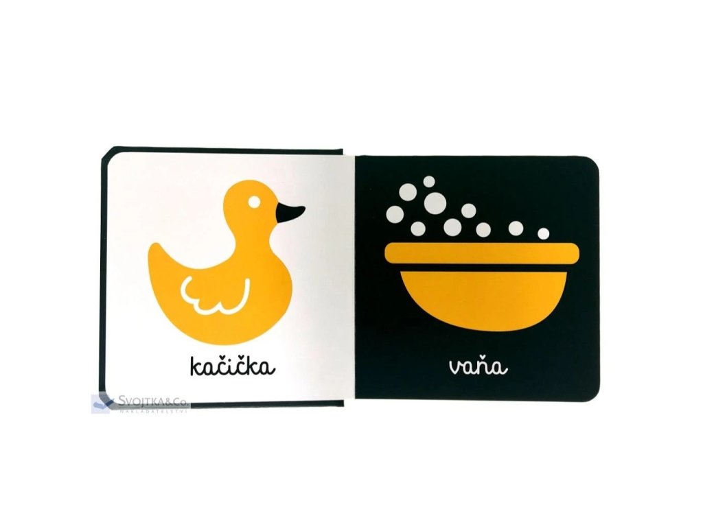 - Kontrastná grafika: Batoľa lepšie rozlišuje kontrasty, preto má táto obrázková knižka jednoduchú čiernobielu grafiku, ktorá je oživená jednou výraznejšou farbou.