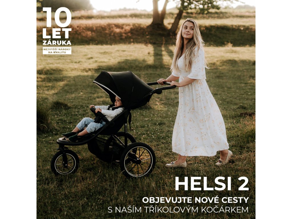 Helsi 2 je terénny športový kočík s tromi nafukovacími kolesami a aretáciou predného kolesa, čo sú kľúčové vlastnosti pre aktívny pohyb a beh na rôznych povrchoch.