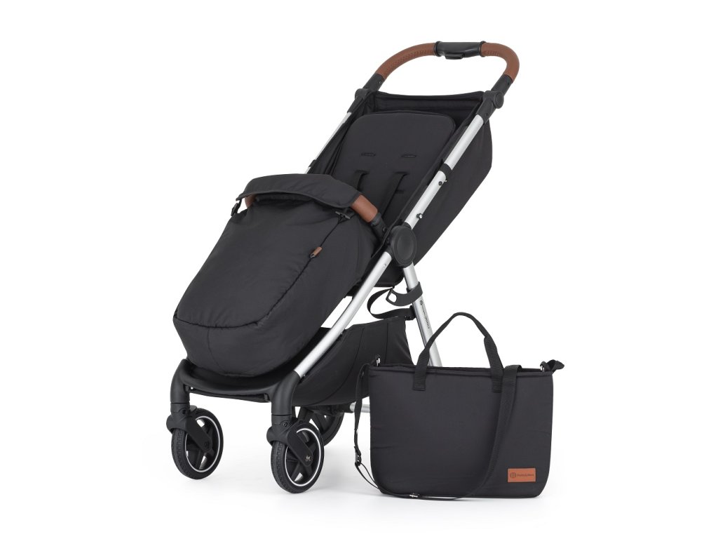 Balenie je kompletné: čierna konštrukcia, strieška, vložka do kočíka, prebaľovacia taška, nánožník a sada polstrovania na pásy.