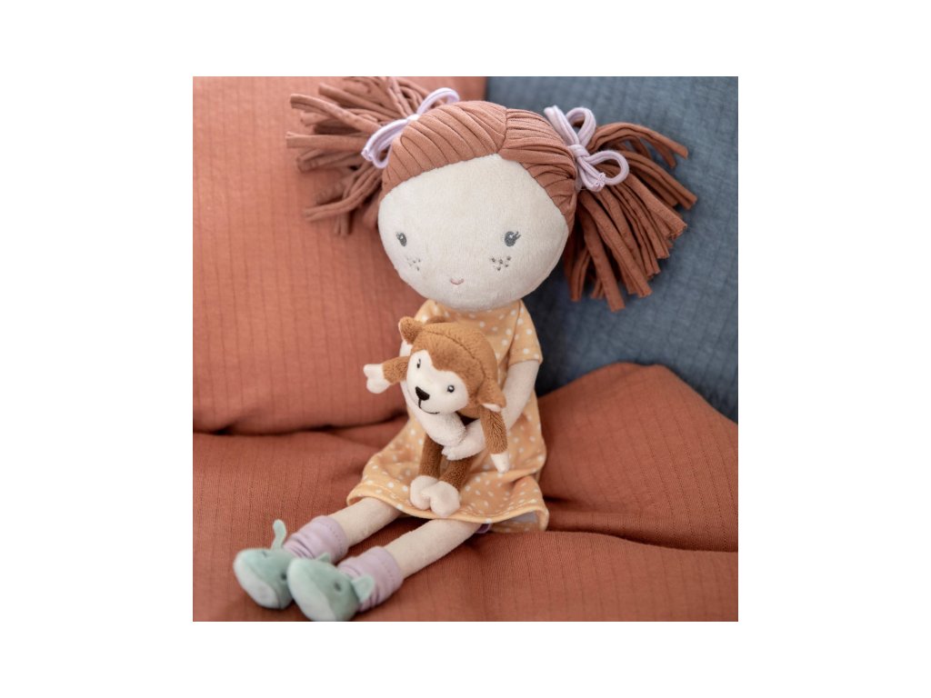 Nežná plyšová bábika Sophia z mäkkého jemného materiálu je oblečená do krásnych bodkovaných šiat. Bábika drží v ruke malú plyšovú opičku, pripevnenú suchým zipsom. Je vhodná na hranie aj maznanie a bude sa s ňou aj krásne zaspávať!Výplň je vyrobená zo 100% recyklovaného polyesteru s certifikáciou GRS (Global Recycled Standard).
