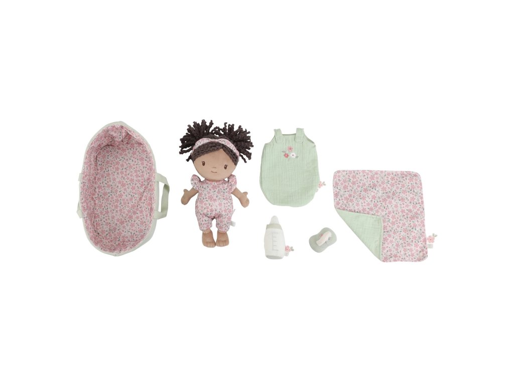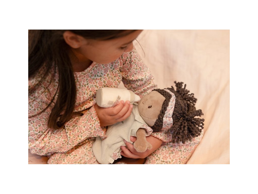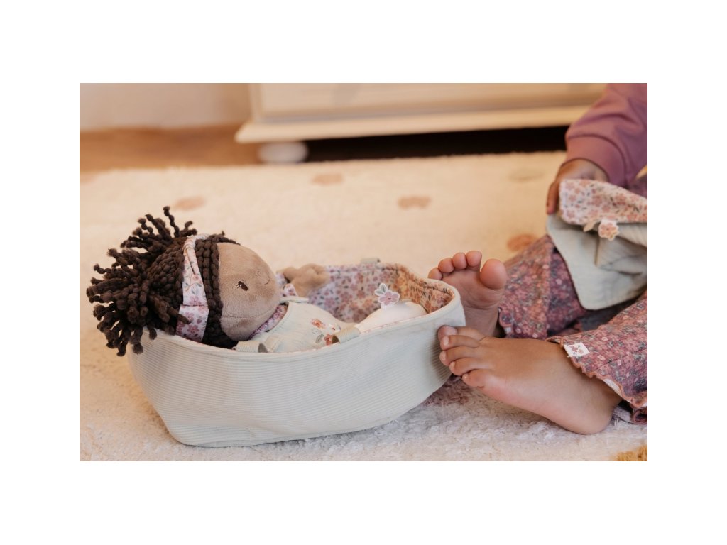 Nežná plyšová bábika Evi sa chce maznať a túliť a vďaka praktickému košíku na spanie si ju môžete vziať kamkoľvek so sebou. Starostlivosť o také bábätko dá zabrať, a deti sa tak hravou formou učia zodpovednosti. Evi je potrebné pravidelne nakŕmiť alebo jej dať cumlík. Na spanie je potrebné Evi uložiť do spacieho vaku a prikryť dekou, aby jej nebola zima.Výplň je vyrobená zo 100% recyklovaného polyesteru s certifikáciou GRS (Global Recycled Standard).
