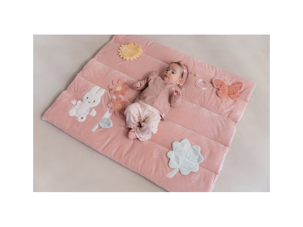 - Zmyslové aktivity: Deka obsahuje plyšovú Miffy, slniečko so zrkadielkom, šuštiaci štvorlístok a hrkajúci krúžok.