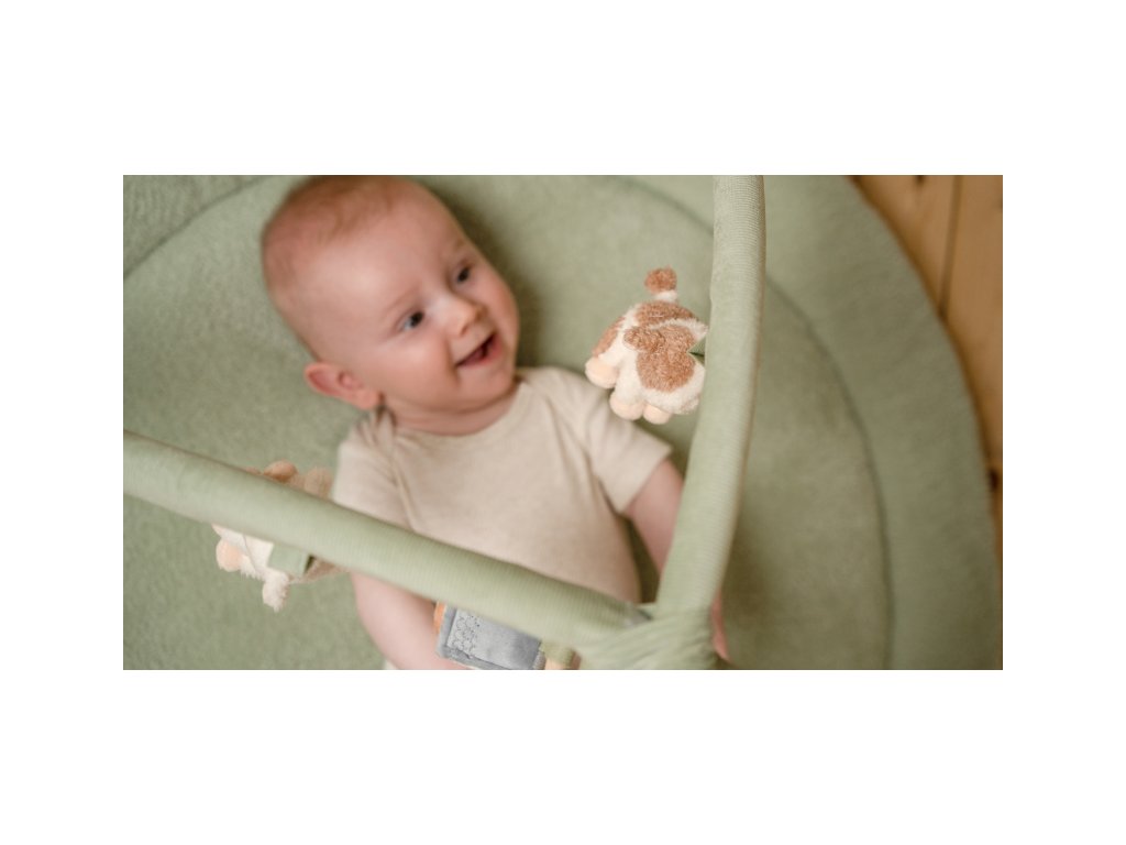 - Podpora motoriky: Aktívne siahanie po hračkách a skúmanie textúr posilňuje svaly rúk a podporuje rozvoj jemnej motoriky.