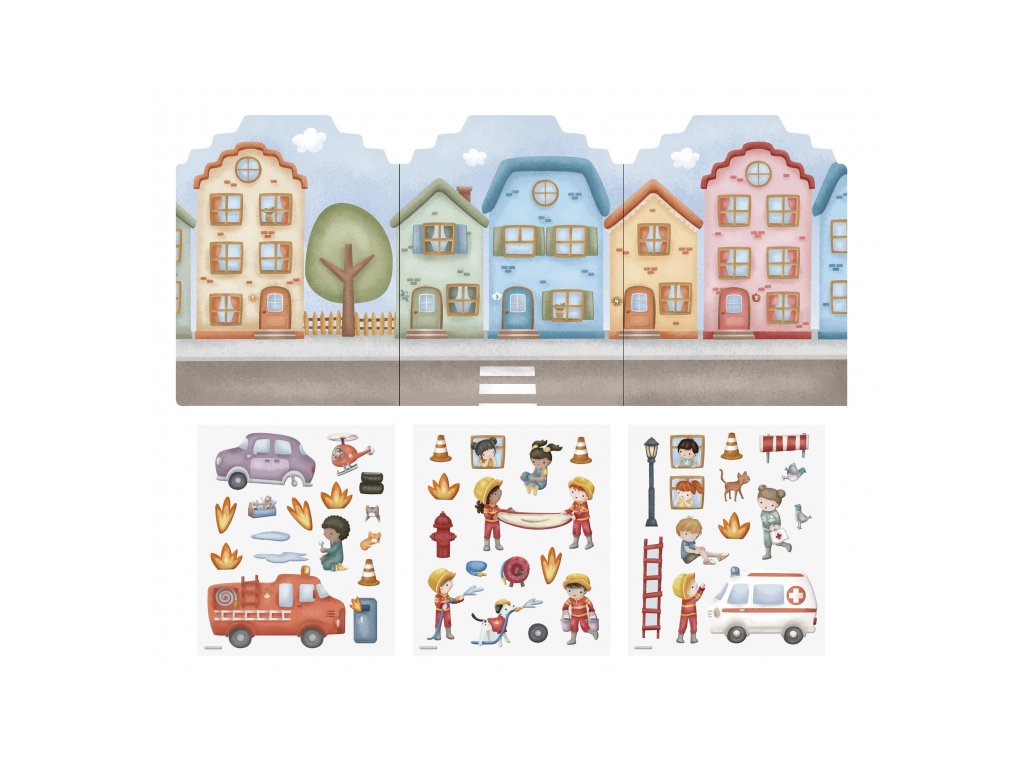 - Viac ako 40 3D samolepiek: Bohatá sada nálepiek s motívom mesta, ulíc a hasičského vybavenia.