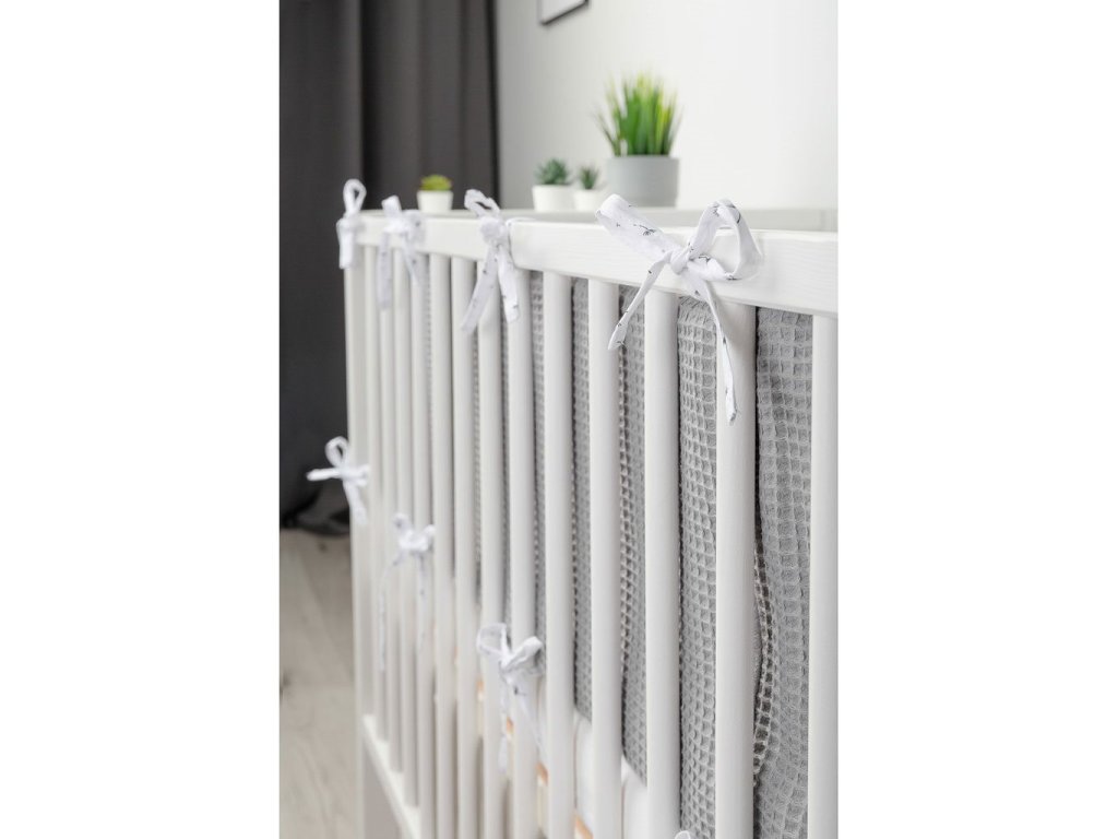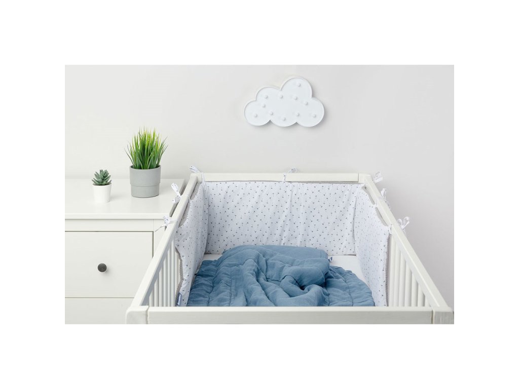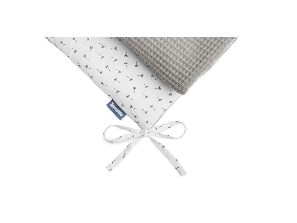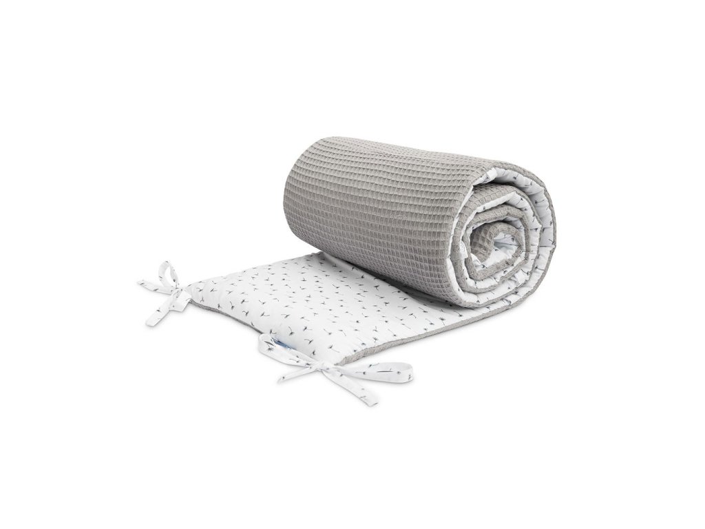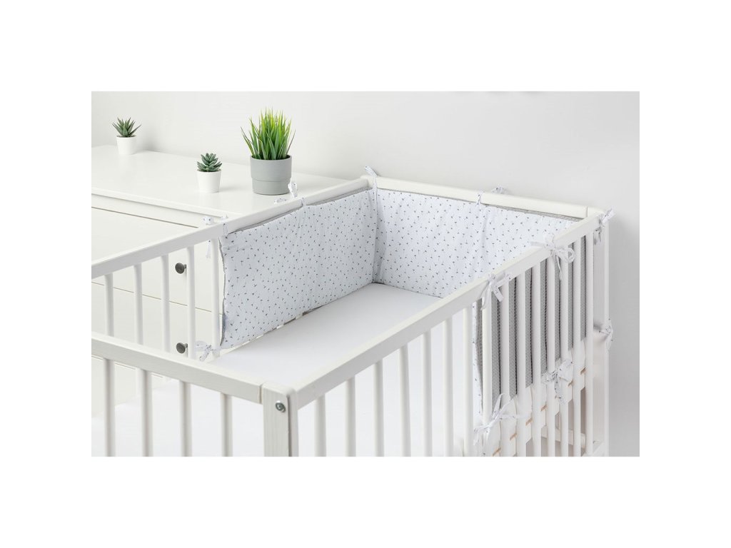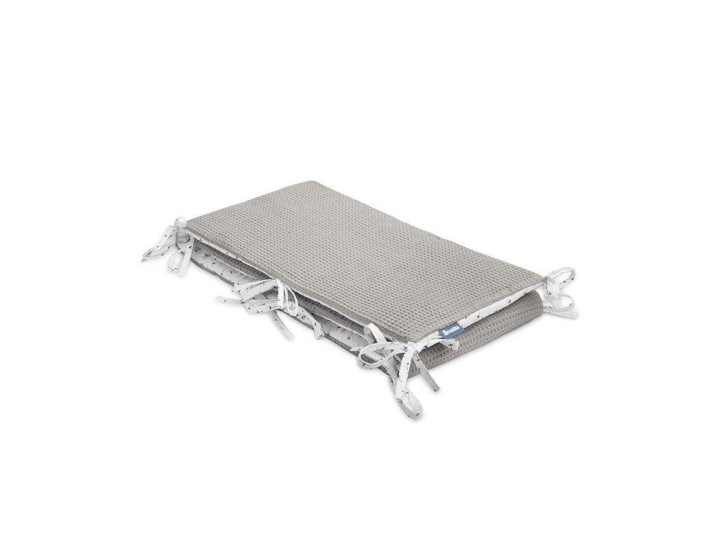 Tenký mantinel do postieľky od Sensillo je alternatívou k veľkým a ťažkým mantinelom bežne používaným v detských postieľkach. Tenká antialergická výplň poskytuje dostatočnú izoláciu, chráni dieťa pred zranením pri pohybe po postieľke a predovšetkým je bezpečná a minimalizuje riziko udusenia. Jedinečný vzhľad nárazníka tvorí kombinácia dvoch materiálov. Jedna strana je vyrobená z mäkkej a na dotyk príjemnej bavlny s vaflovou štruktúrou a druhá strana je vyrobená z bavlny s farebnou potlačou. Obe látky majú certifikát Oeko-Tex. Každých 30 cm sú všité pásiky, ktoré pre upevnenie zaisťujú držanie mantinelu v správnej polohe. Mantinel má nielen praktickú funkciu, ale je aj ozdobou detskej izby. Bol navrhnutý pre postieľku s rozmermi 120x60 cm.