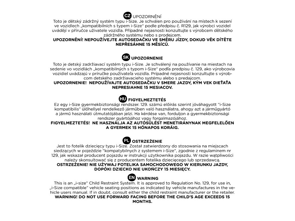 Toto je detský zádržný systém typu i-Size. Je schválený na používanie na miestach na sedenie vo vozidlách kompatibilných s typom i-Size, podľa predpisu č. 129, ako výrobcovia vozidiel uvádzajú v príručke používateľa vozidla. Prípadne nejasnosti konzultujte s výrobcom detského zadržiavaceho systému alebo s predajcom.