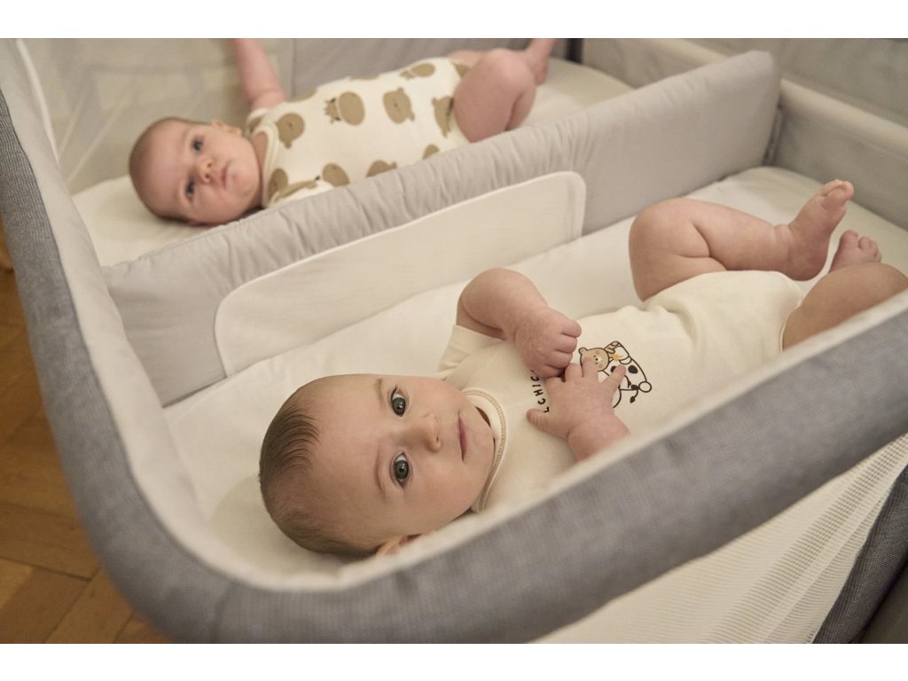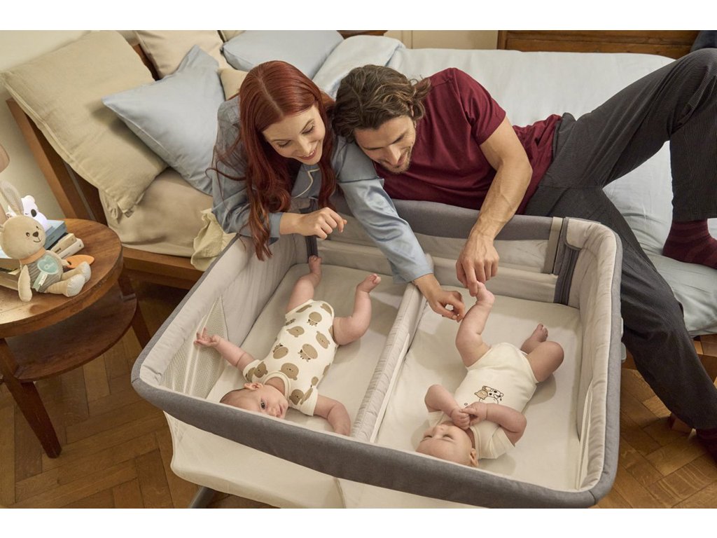 Spánok v tesnej blízkosti rodičov znižuje stres u novorodencov a pomáha synchronizovať spánkové cykly dvojičiek. Vďaka 11 výškovým polohám môžete postieľku nastaviť tak, aby ste mali bábätká vždy v úrovni očí. Mäkké polstrovanie a priedušné materiály vytvárajú útulné hniezdočko, v ktorom sa vaše deti budú cítiť bezpečne od prvého dňa.