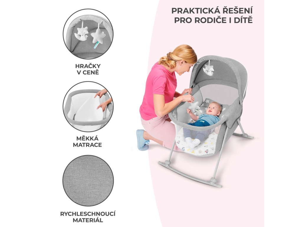 - Kolíska: Stačí prestaviť lyžiny (bežce) na nohách postieľky a jemným hojdaním bábätko upokojíte a uspíte.