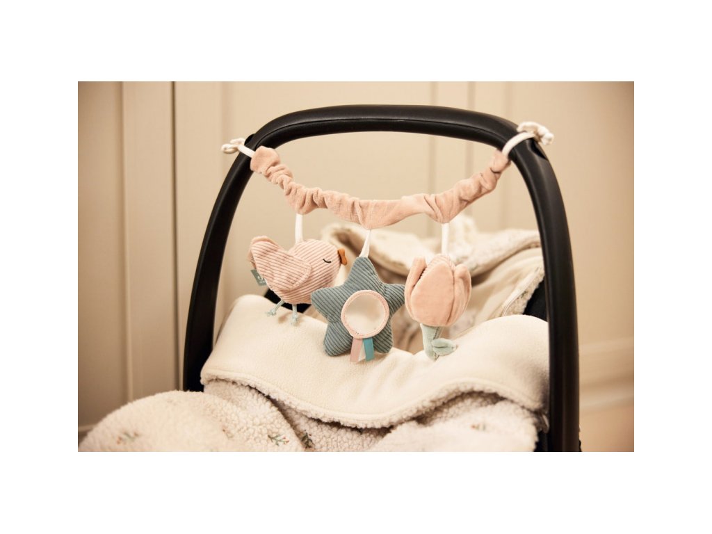 - Multisenzorický zážitok: Hračky v podobe vtáčika, tulipánu a hviezdičky kombinujú hrkanie, šušťanie a rôzne textúry.