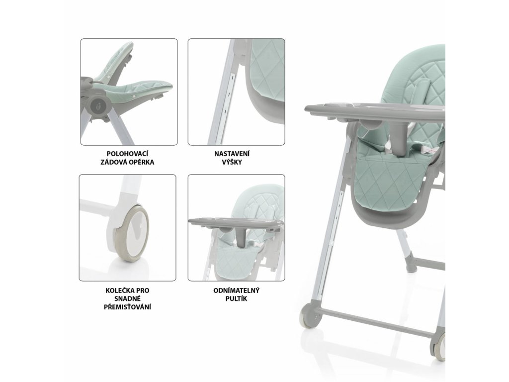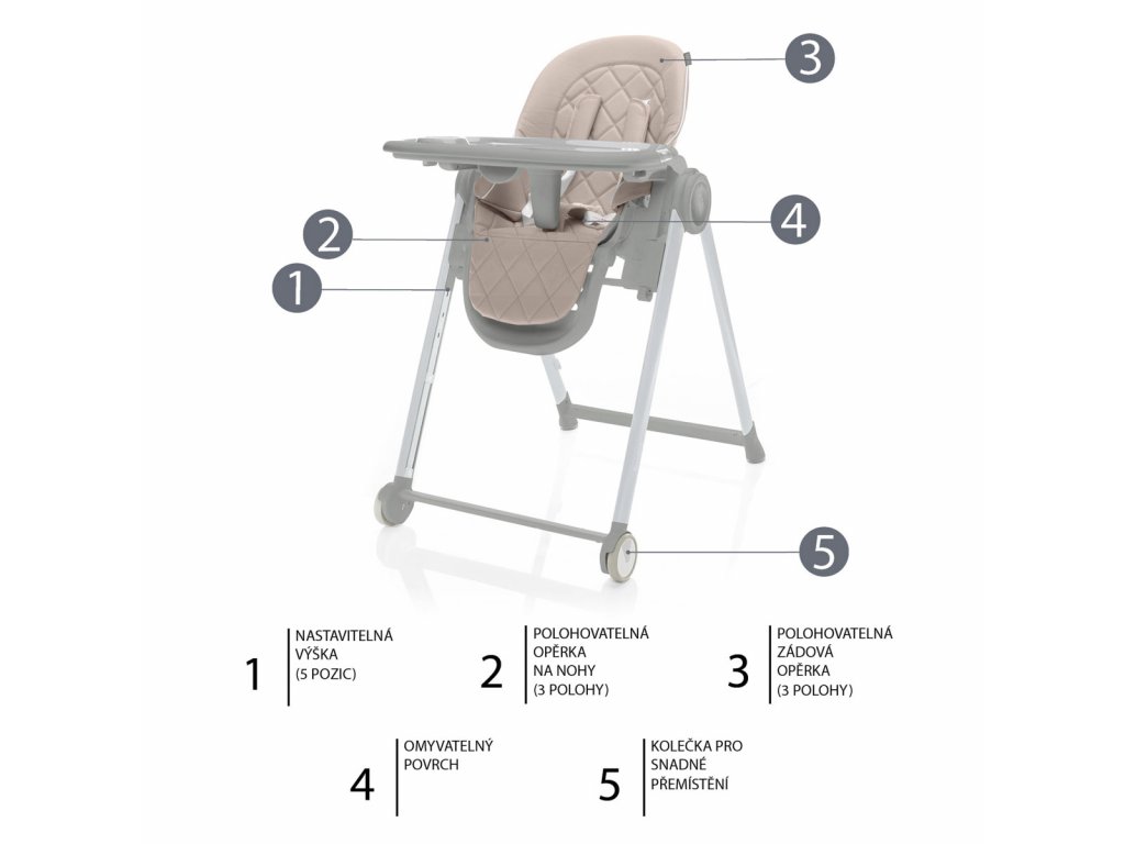 Space má 5 úrovní nastavenia výšky, takže sa dá prispôsobiť takmer každému stolu a užiť si spoločné rodinné stolovanie. Opierku chrbta možno nastaviť do 3 polôh, rovnako ako opierku nôh. Vďaka tomu je možné stoličku používať nielen na kŕmenie, ale aj na odpočinok alebo ako bezpečné miesto na hranie.