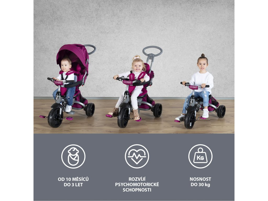 - Rastie s dieťaťom: Odnímateľná strieška, hrazda, opierky nôh a pedále umožňujú postupnú transformáciu na klasickú trojkolku.