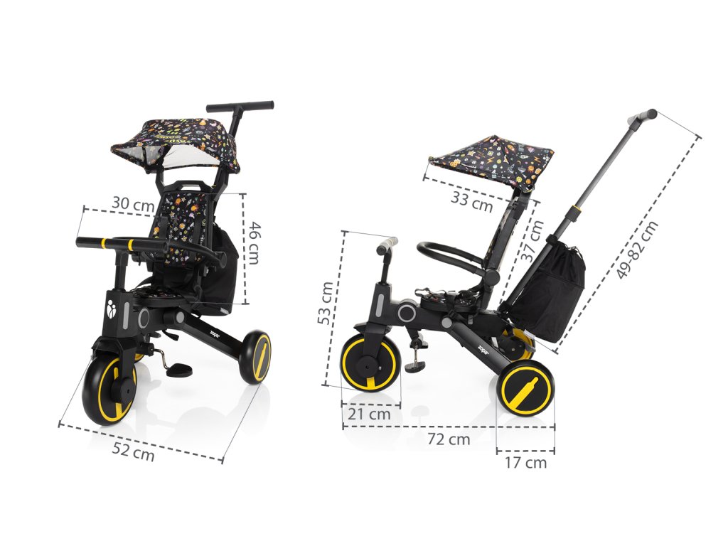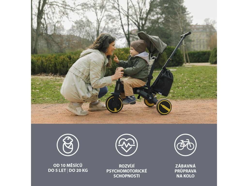 Trojkolka je pohodlnejšou alternatívou ku kočíku a zároveň medzikrokom k odrážadlám a kolesám. Vďaka výškovo nastaviteľnej vodiacej tyči a funkcii vypnutia riadidiel plne nahradí kočík a dieťa si pri jazde užije viac zábavy. Odnímateľné šlapátka sa dajú využiť ako pedále, kedy dieťa riadi trojkolku samo, alebo pre menšie deti ako opierka nôh. Komfortnejšiu jazdu má na starosť podsedák aj opierka chrbta, tie sú opatrené polstrovaním, ktoré je odnímateľné pre ľahšie čistenie.