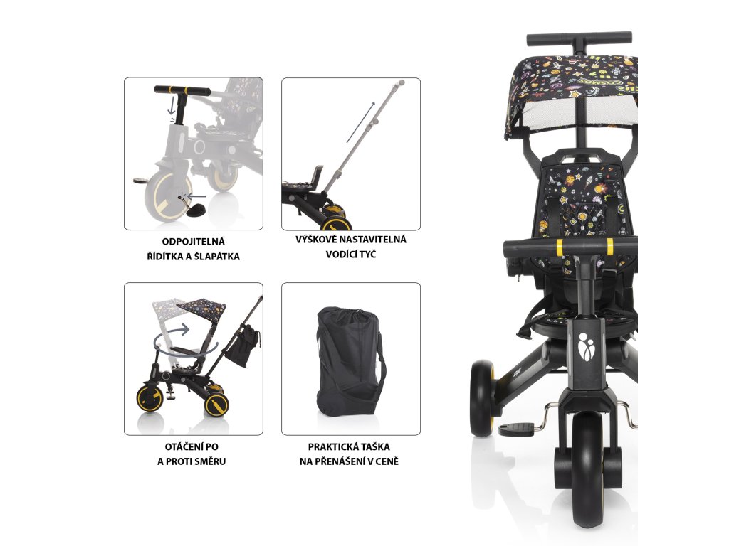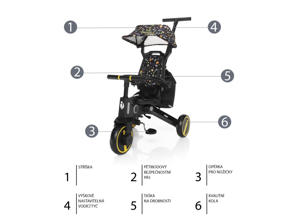 - Odpojiteľné pedále, chrbtová opierka, vodiaca tyč, strieška
