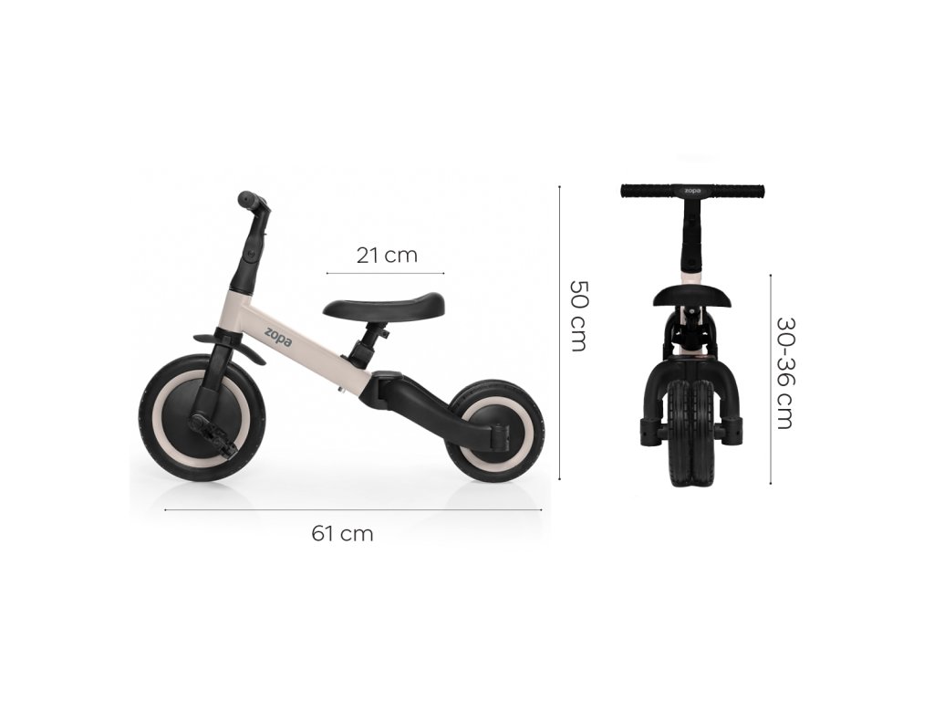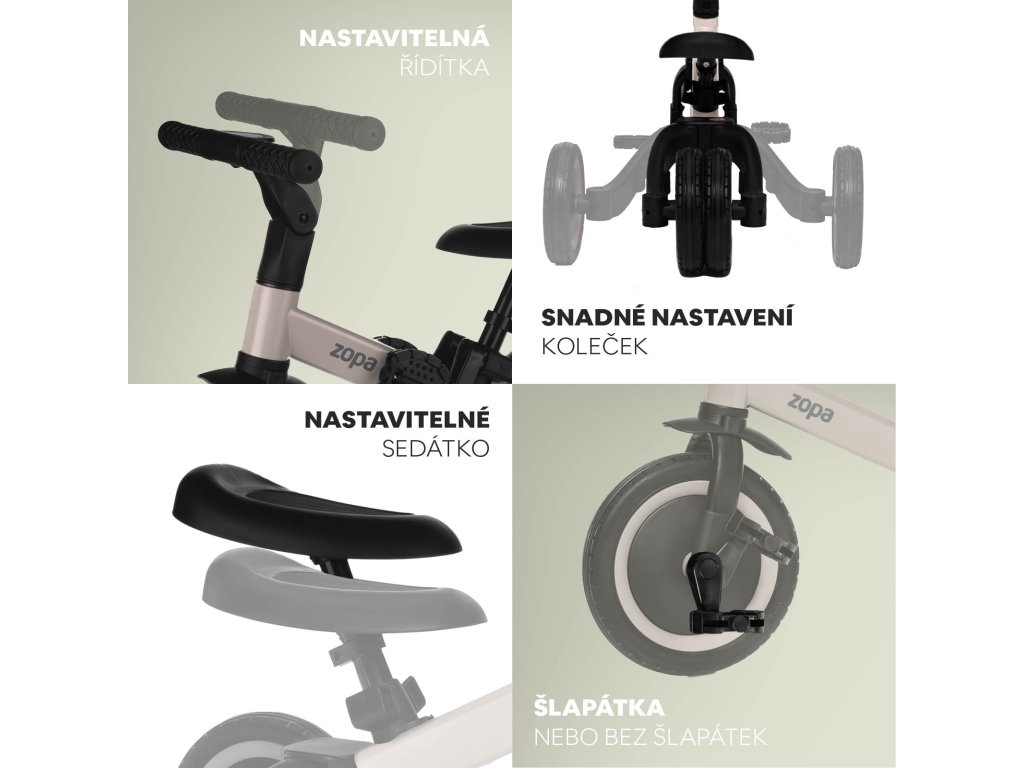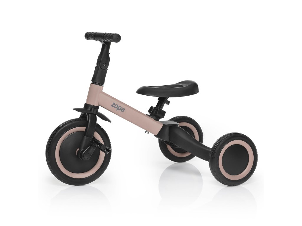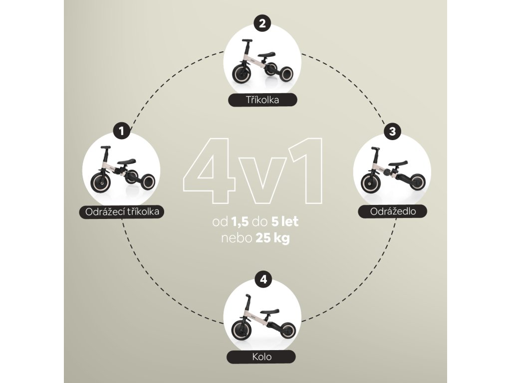 - Funkcia 4v1: Odrážacia trojkolka (1,5–2 roky), klasická trojkolka (2–3 roky), odrážadlo (3–4 roky) a bicykel (4–5 rokov).