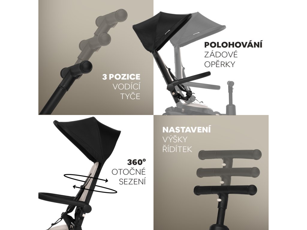 - Otočné sedadlo o 360°: Umožňuje jazdu v smere aj proti smeru jazdy, čím uľahčuje kontakt s rodičom.