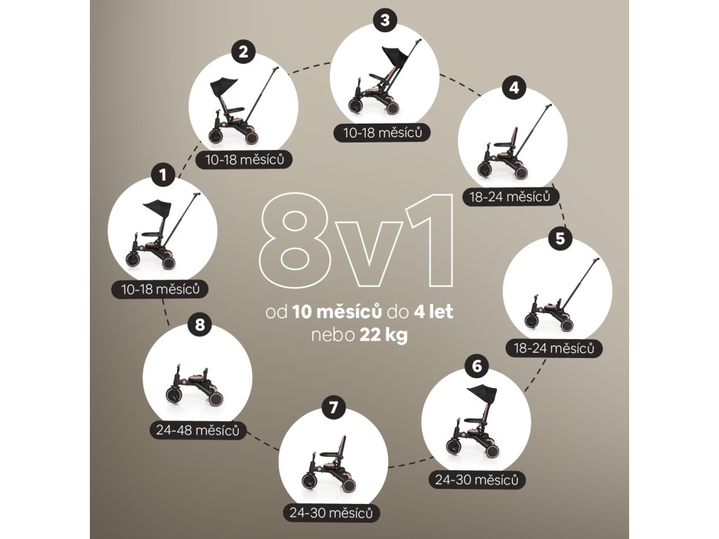 - 8 variantov použitia: Trojkolka sa mení podľa veku a zručností dieťaťa.