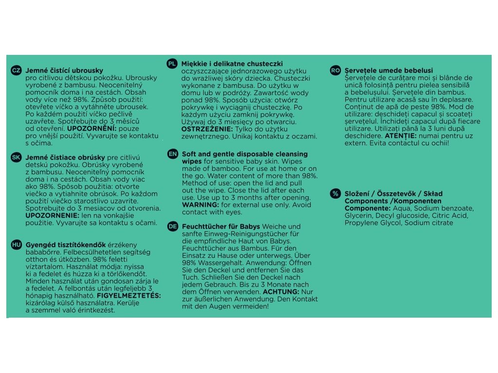 - Vysoký obsah vody: Viac ako 98 % zloženia tvorí čistá voda pre maximálnu šetrnosť.