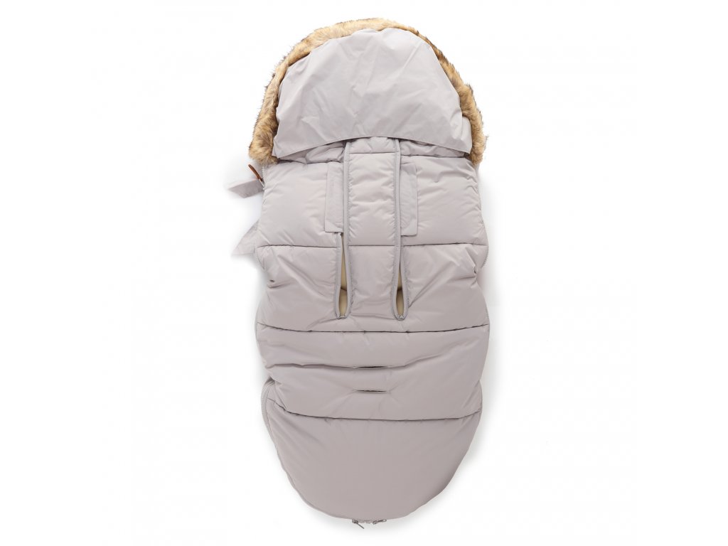 Fusak má ozdobný kožušinový lem, ktorý sa dá aj demontovať. Na spodnej strane nájdete otvory na popruhy. Sú riešené tak, aby ste fusak dali aj do kočíkov, ktoré nemajú úplne rozdeliteľné popruhy (Cybex a pod.) Spodná strana má aj protišmykovú úpravu aby sa fusak nezošmýkaval.